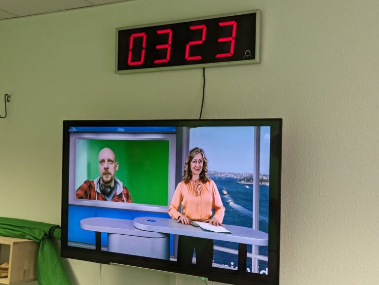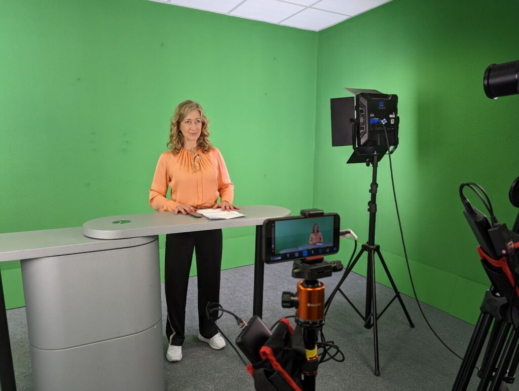 Unter anderem konnten wir hier auch den Green Screen Room in unserem neuen Zuhause nutzen, um digitale Zuschaltungen zu simulieren und interaktiver ins Bild einzubinden.