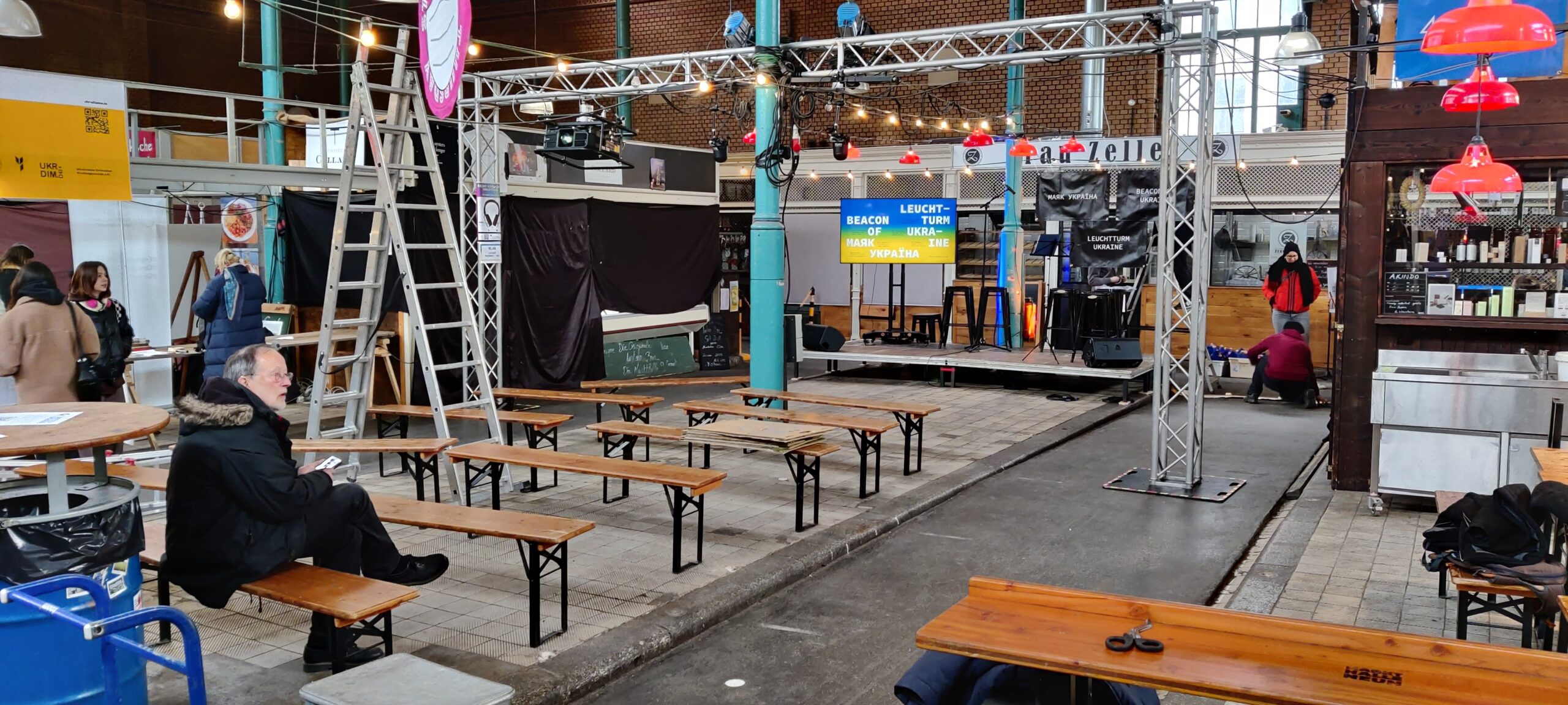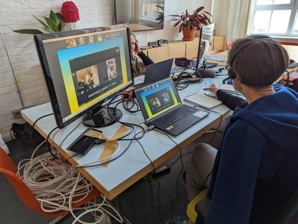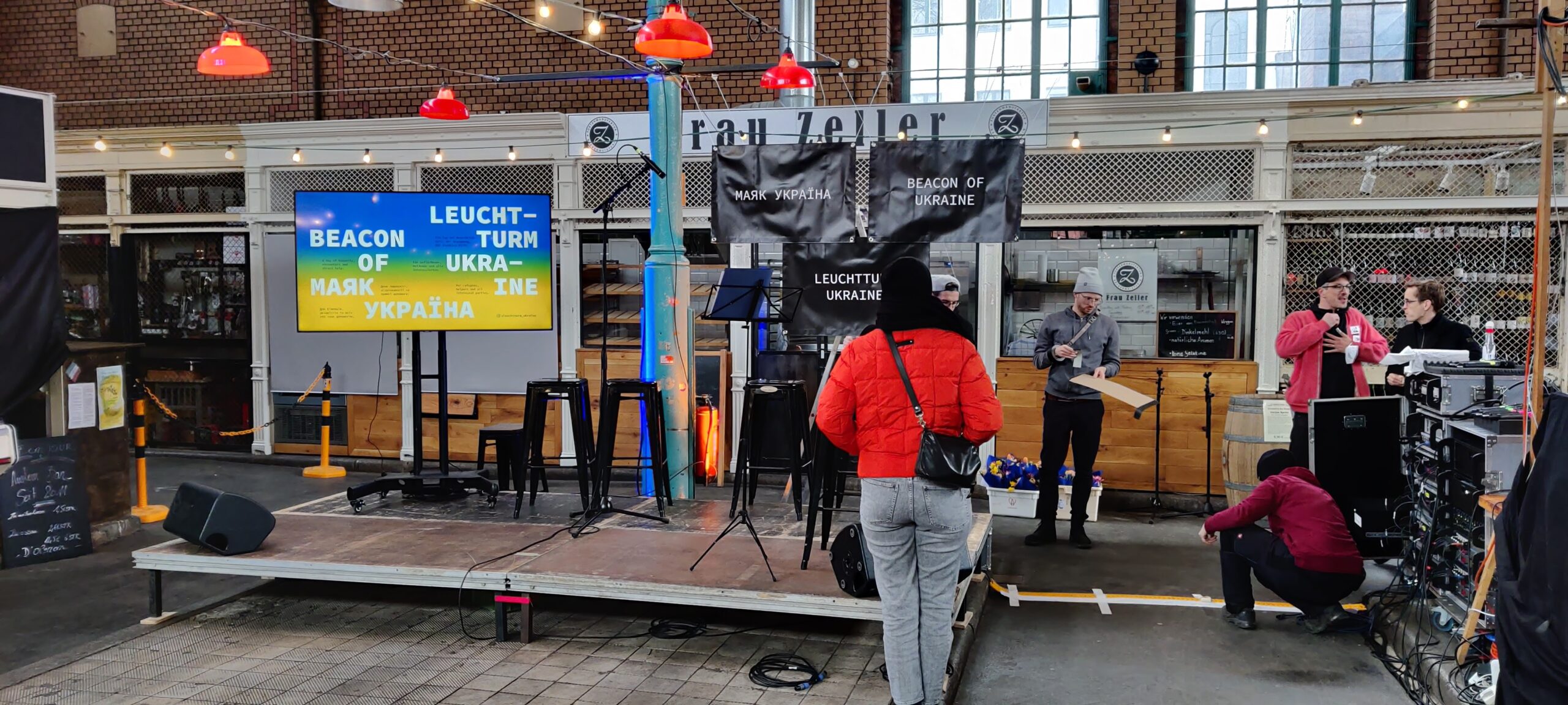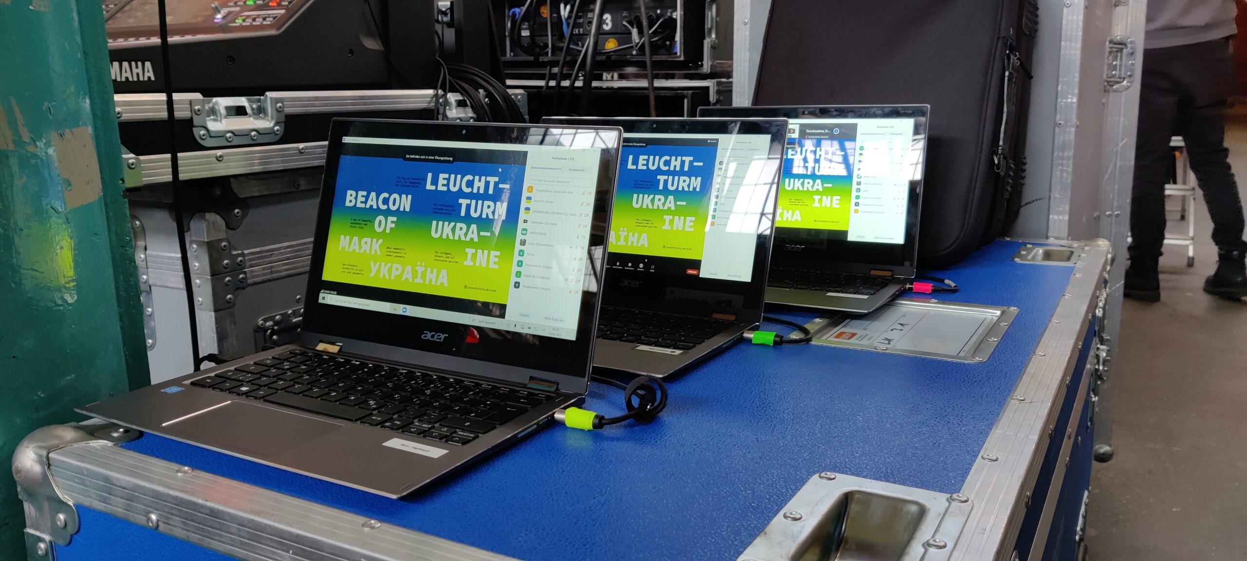 Wir waren daher sehr dankbar, dass wir wenigstens ein kleines bisschen mit unseren Ressourcen und Fähigkeiten helfen konnten. Letzte Woche haben wir das Projekt/Event „Leuchtturm Ukraine“ aus Kreuzberg unterstützt. Dabei haben wir die komplette Technik für die Übersetzung in drei Sprachen und die Vorbereitung der virtuellen Gäste übernommen.
