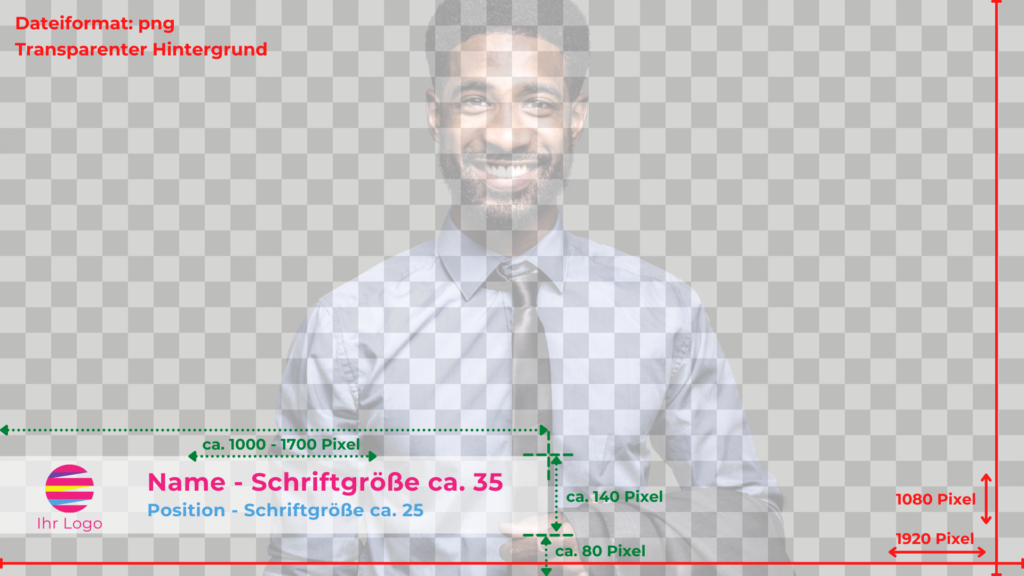 Bauchbinden werden für Namens­einblendungen oder Call-to-Actions genutzt. Sie werden am unteren Bildrand eingeblendet, um Namen und Funktionen von Speaker:innen zu zeigen oder Aufforderungen an die Zuschauer:innen einzublenden. Bitte nicht zu groß gestalten!