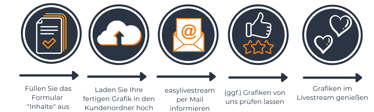 Füllen Sie das Formular “Inhalte” aus. Lesen Sie die Hinweise zur Grafikerstellung genau. Laden Sie Ihre fertigen Grafiken in den Kundenordner hoch (Ordner “Ihre Uploads”). Den Link haben Sie mit unserer Zusage zum Auftrag erhalten. Informieren Sie uns nach dem Upload mit einer kurzen E-Mail an support@easylivestream.de. Teilen Sie uns dort auch mit, ob Sie einen Grafikcheck durch uns wünschen (25 €).