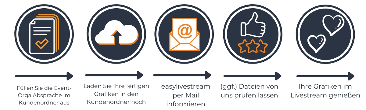 So geht es: Füllen Sie die Event-Orga-Absprache in Ihrem Kundenordner aus. Lesen Sie die Hinweise zur Grafikerstellung genau. Laden Sie dann Ihre fertigen Grafiken in den Kundenordner hoch (Ordner „03 Grafiken_ Texttafeln, Namenseinblendungen, Thumbnails„). Den Link zu Ihrem Kundenordner haben Sie mit unserer Zusage zum Auftrag erhalten. Informieren Sie uns nach dem Upload mit einer kurzen E-Mail an support@easylivestream.de. Teilen Sie uns dort auch mit, ob Sie einen Grafikcheck durch uns wünschen (25 €).