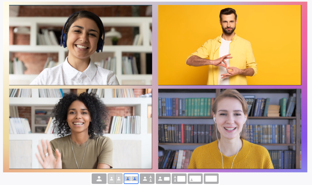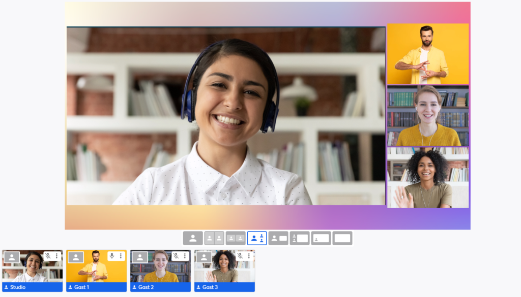 Bei der Verwendung von Streamyard sind verschiedene Layouts für die Darstellung der Speaker:innen im „Sendebild“ möglich. Das gewählte Layout passt sich dabei automatisch und dynamisch der Anzahl der Speaker:innen im Bild an. Maximal können 10 Personen gleichzeitig „on air“ sein.
