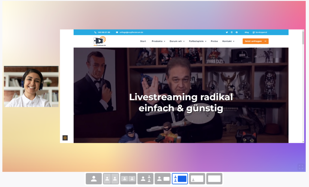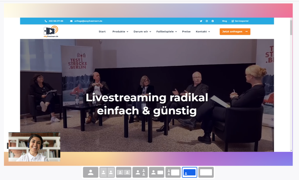 Neben der Darstellung von Kamerabildern bietet Streamyard auch die Möglichkeit Präsentationen, Videos, weitere Kamerabilder von einem/einer Speaker:in oder Bildschirmfreigaben zu integrieren. Auch dafür gibt es verschiedene Layout-Varianten zur Anordnung eines oder mehrerer Speaker:innen.