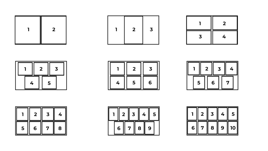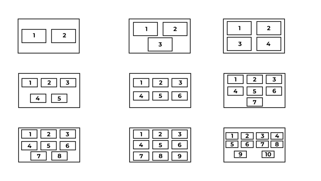 Die Kachelansicht ermöglicht mehrere beteiligte Personen mit ihrem vollständigen Bild zu zeigen. Die Anordnung der Kacheln folgt dabei folgendem Schema: