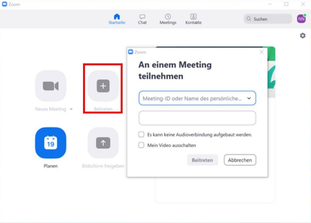 Sollte sich die Zoom-App beim Klick auf den Link nicht automatisch öffnen, öffnen Sie das Programm manuell. Sie müssen die dann die Nummer der Zoom-Videokonferenz (auch “Meeting-ID” genannt) manuell in ihrer App eintragen. Dies können Sie tun, indem Sie auf “Meeting beitreten” klicken. Die Meeting ID erhalten Sie von dem/der Veranstalter:in.