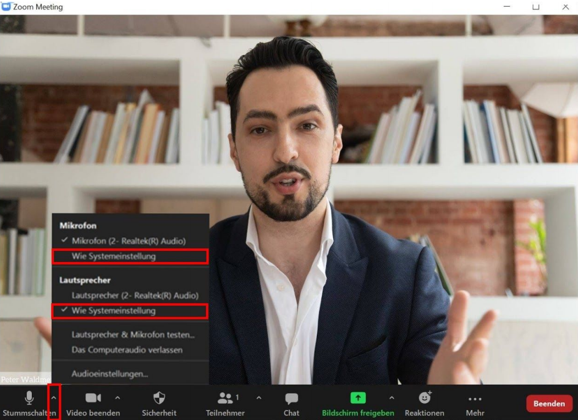 Im Menü können Sie das richtige Mikrofon auswählen. Probieren Sie einfach alle Audio-Eingänge aus. Wenn keines geht, können Sie unter “Audioeinstellungen” (ganz unten) noch weitere Einstellungen vornehmen. Bitte testen Sie all dies vor der Veranstaltung, am besten schon in einem ZOOM-Call, z.B. mit einem/einer Freund:in! Während der Veranstaltung ist es schwierig Ihnen noch zu helfen, da dann alles öffentlich im Videocall stattfindet.