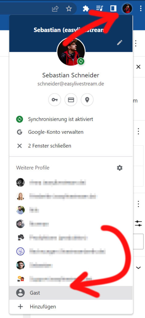 Wenn Sie nur einen Computer haben: Betreten Sie die zwei Sendestudios in unterschiedlichen Browsern oder in zwei verschiedenen Google-Chrome-Benutzerfenstern mit unterschiedlichen Benutzer-Profilen. Letzteres funktioniert folgendermaßen: