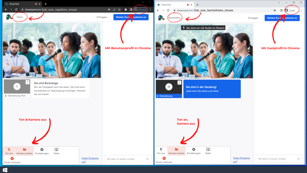 – Rufen Sie bitte beide Links auf. Sie hören den Ton im ersten Sende-Studio ab. Bitte deaktivieren Sie dort Ihre Kamera und ihr Mikrofon. Sie sind hier nur als Gast.
