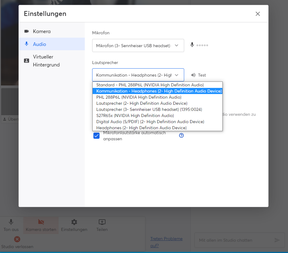 D) In beiden Studios können Sie über „Settings“ (finden Sie in der Mitte unten) Ihre Audioeinstellungen wählen. Wählen Sie für Sudio 1 und Studio 2 jeweils ein unterschiedliches Headset.