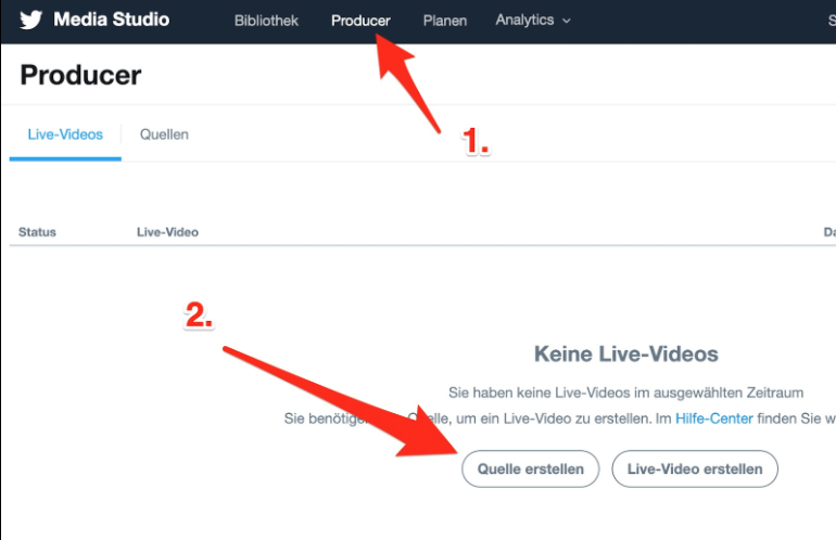 3.) Rufen Sie bitte https://studio.twitter.com/ auf und klicken sie oben auf den Reiter “Producer” oder rufen direkt https://studio.twitter.com/producer auf. (Wenn Sie beim Aufrufen nur auf media.twitter.com weitergeleitet werden, ist ihr Twitter-Account nicht für das Studio freigeschaltet. Voraussetzungen für eine Freischaltung sind: Mindestens 5000 Follower:innen, Verifizierter Account.) Sie können eine Freischaltung des Media Studios beantragen, dieser Prozess ist allerdings langwierig und bietet keine Garantie für eine Freischaltung. Bitte kontaktieren sie für weitere Informationen diesbezüglich das Twitter Support Team.