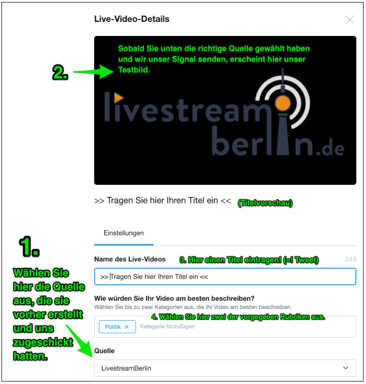 10.) Geben Sie noch einen Titel für den Livestream an und wählen Sie in welche Kategorie der Livestream gehört, z.B. “Politik” oder “Sport” etc.