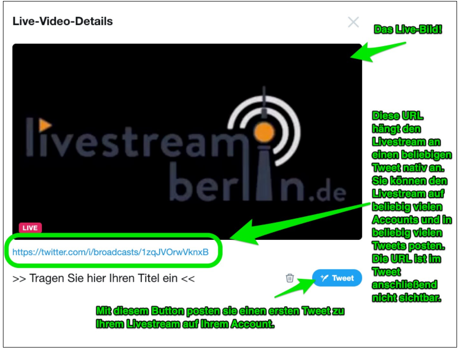 15.) Los gehts: Der Livestream ist jetzt online und sie können Ihren ersten Tweet zum Livestream posten. Nutzen Sie dazu den blauen “Tweet”-Button unten oder kopieren sie sich einfach die URL (unten markiert) und fügen Sie sie einen beliebigen Tweet ein.