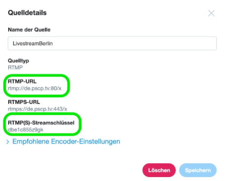 6.) Danach zeigt Ihnen Twitter eine RMTP-URL und einen Streamkey für diese Quelle an. Kopieren Sie diese und schicken sie die beiden Daten an uns (info@easylivestream.de) oder per WhatsApp an +49 176 20336676. Idealerweise tun Sie dies bitte drei bis vier Tage vor dem Event. Klicken sie abschließend auf “Speichern”.