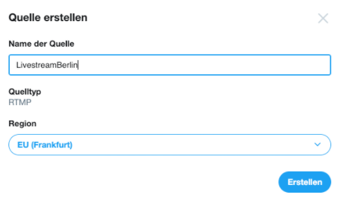 5.) Geben Sie der Quelle einen Namen (wird nicht öffentlich angezeigt) und wählen Sie als Region “EU (Frankfurt)” aus. Klicken Sie auf “Erstellen”.