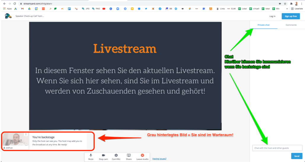 - Achtung: Wenn Sie im Warteraum sind können Sie nicht mit den anderen Teilnehmenden des Livestreams oder der Backstage per Sprache kommunizieren, da sie (noch) stummgeschaltet sind. Erst wenn wir Sie “live” schalten, können sie sprechen.