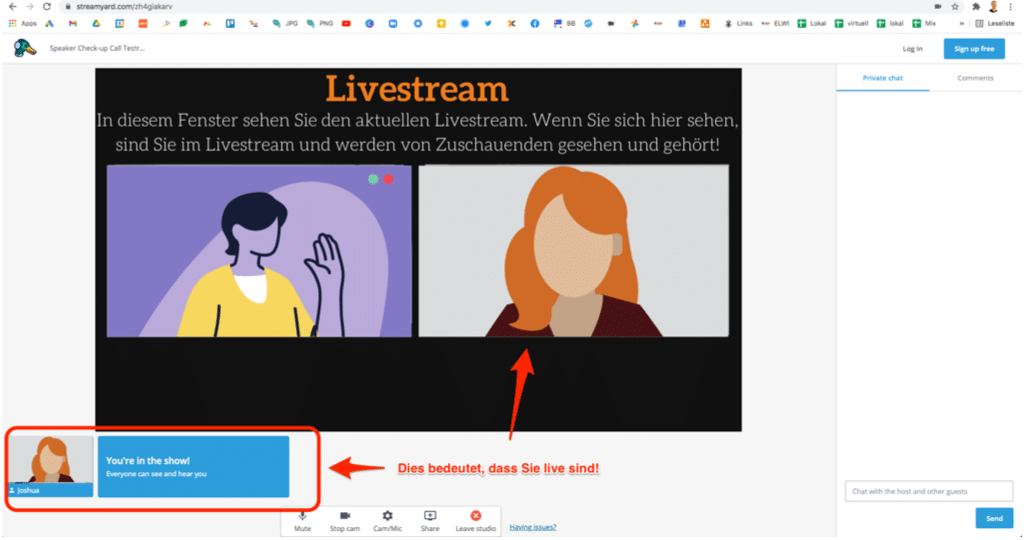 - Beachten Sie, dass Sie sich während des Events nicht mehr mit der Moderation unterhalten können. Bei kurzen Events sollten daher alle Speaker:innen des Events bereits 20-30 Minuten vor dem Start in Streamyard sein.