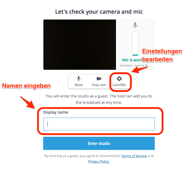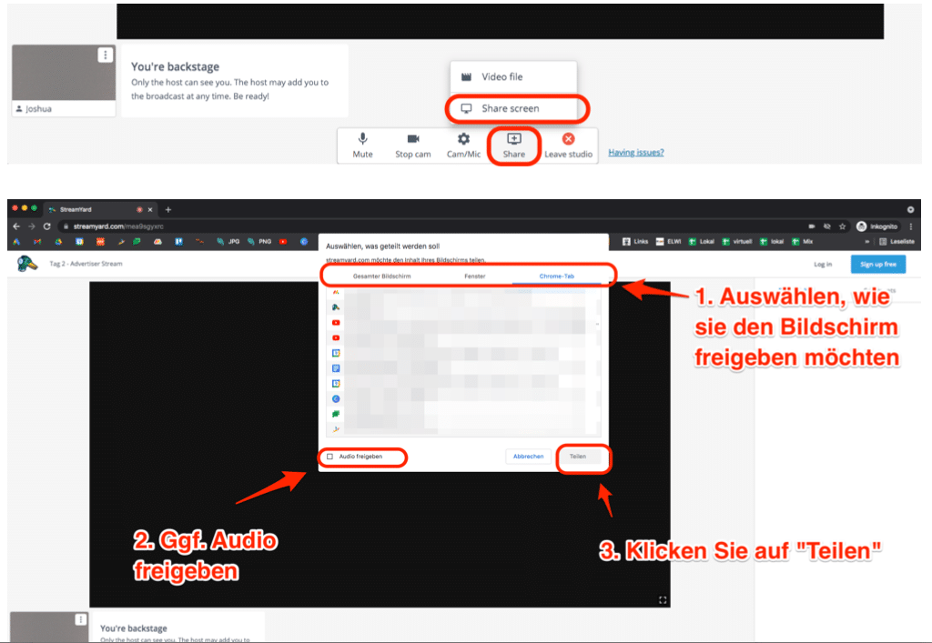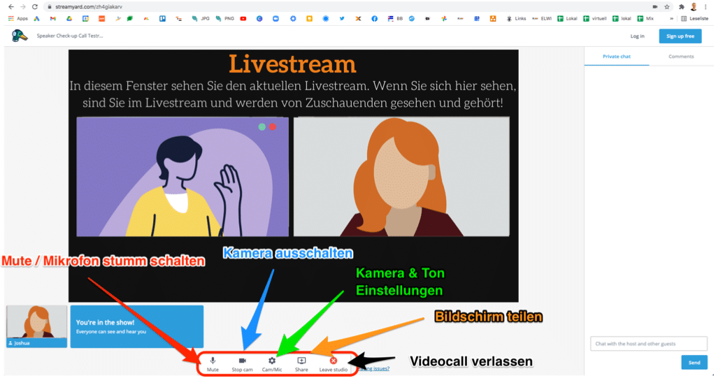 Streamyard ist eine Livestream-Produktions-Software im Browser. Sie werden sich mit Hilfe Ihres Browser dazuschalten, damit wir Ihr Webcam-Bild und Ihr Headset-Audioton in die Livestream-Produktion einbinden können.